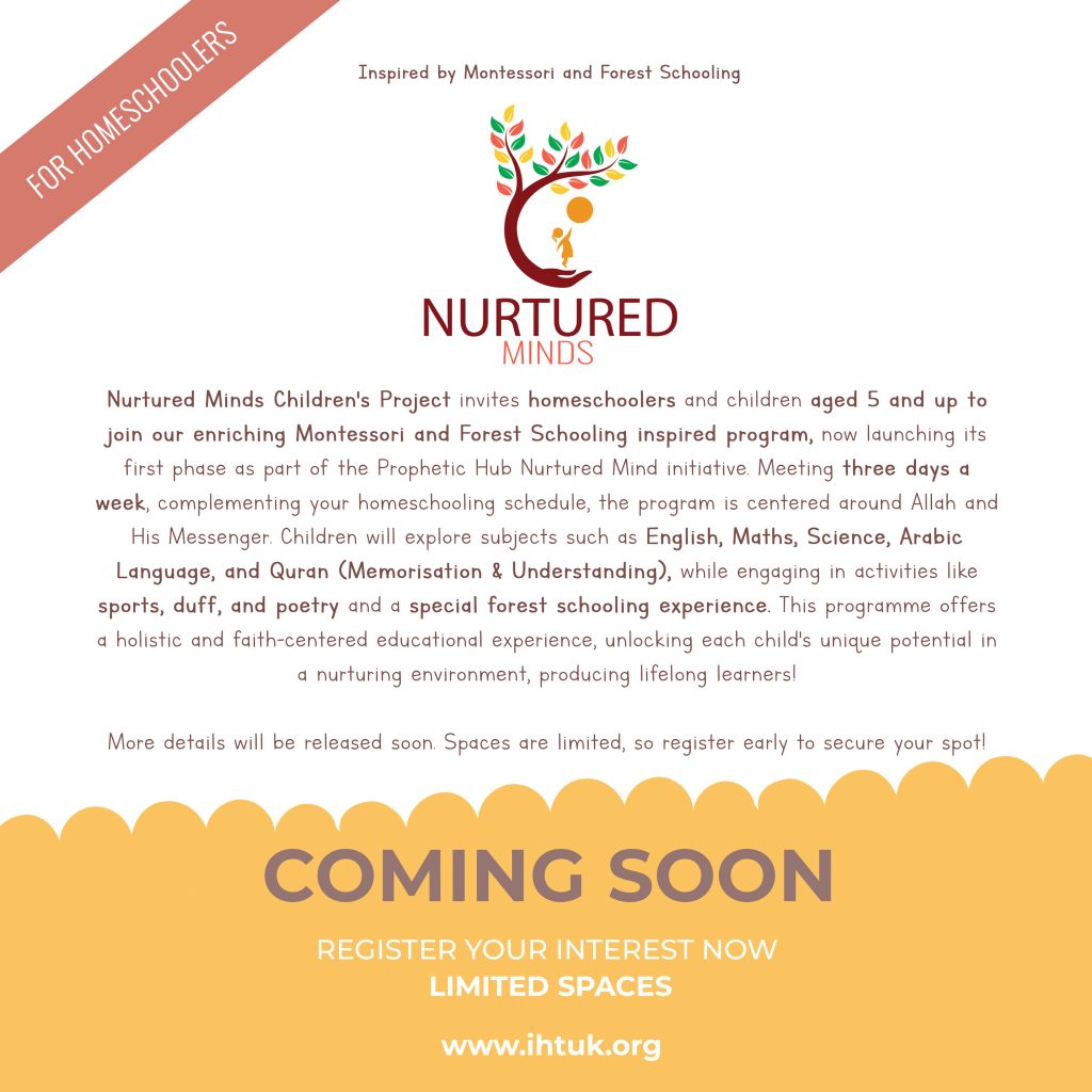 Nurtured Minds Children’s Project invites homeschoolers and children aged 5 and up to join our enriching Montessori-inspired program, now launching its first phase as part of the Prophetic Hub Nurtured Mind initiative. Meeting three days a week, complementing your homeschooling schedule, the program is centered around Allah and His Messenger. Children will explore subjects such as English, Maths, Science, and Arabic Language, and Quran (Memorisation & Understanding) while engaging in activities like sports, duff, and poetry. This programme offers a holistic and faith-centered educational experience, unlocking each child’s unique potential in a nurturing environment, producing lifelong learners!